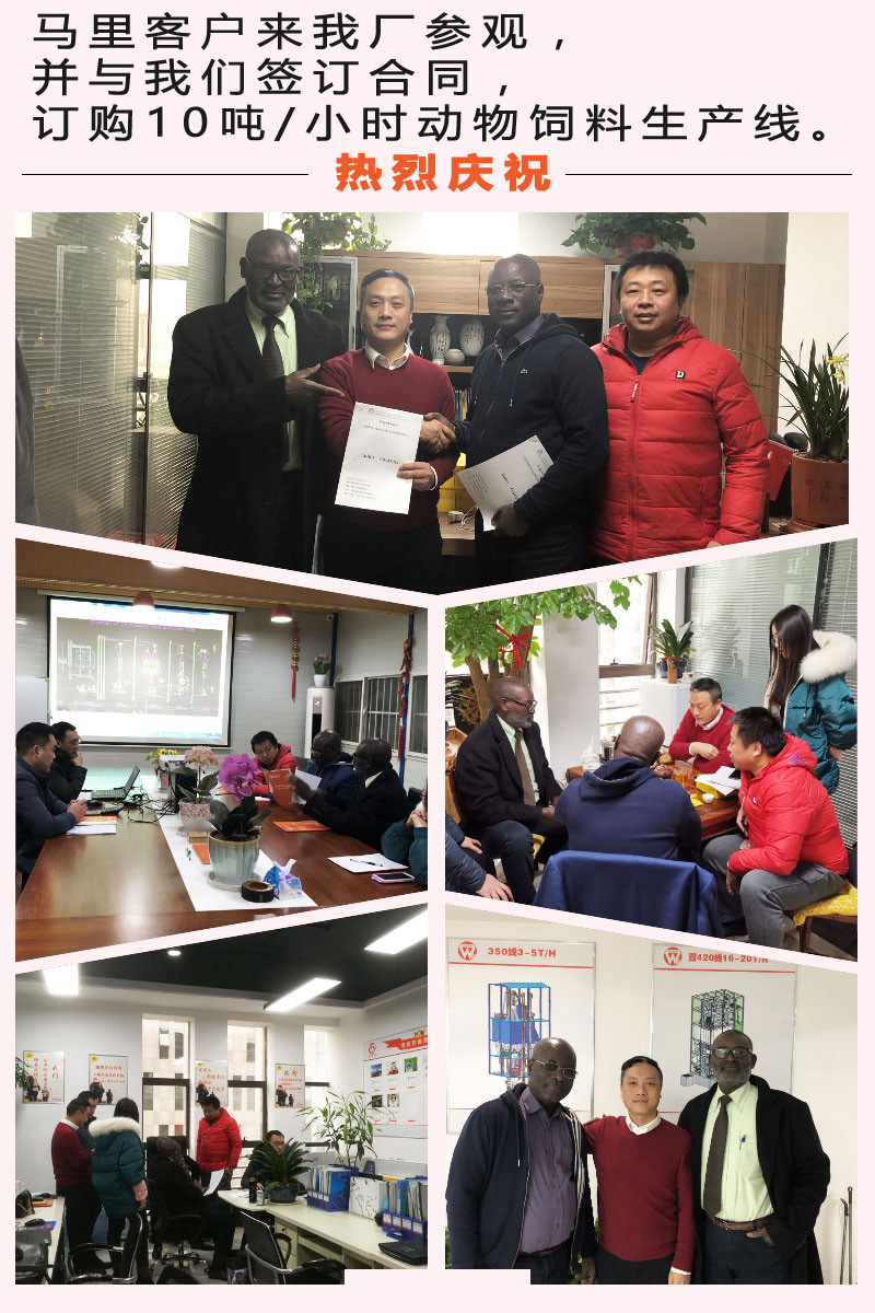 祝賀:來自馬里的客戶來我廠參觀,并與我們簽訂合同,訂購10噸/小時動物飼料生產線。